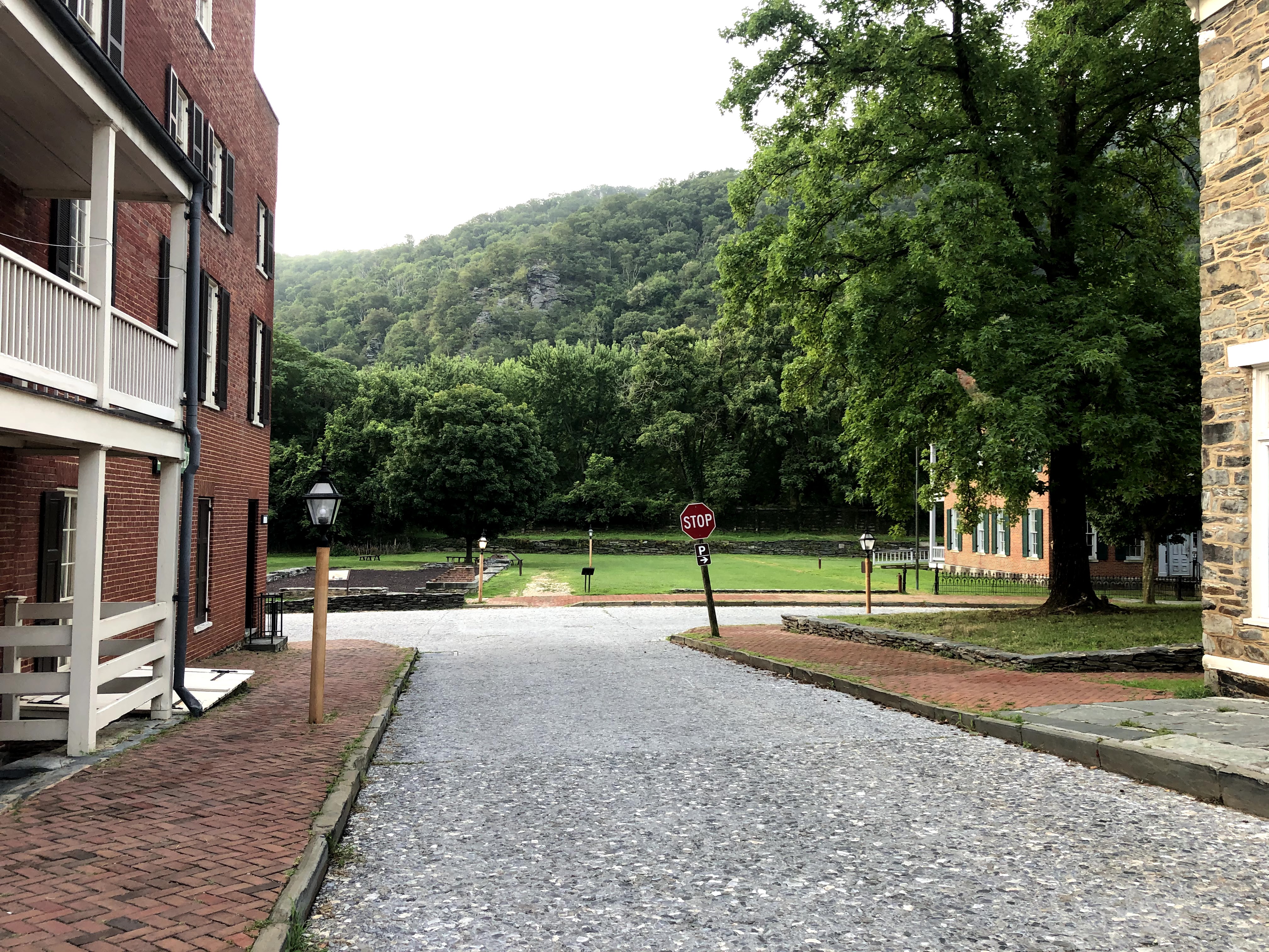 The trail from Harpers Ferry to the Maryland border is rocky at first. Most of it seemed to be rock steps, and if it had been even a little dewy it would have been treacherous. On the way down, we passed three deer — a mum and two spotted fawns. The fawns jumped out of our way quickly, but the doe kept her eyes trained on us until we disappeared over another crest. After a little while on the trail, you come back into Harpers Ferry, where you have to walk past a ruined church and then past another one, albeit functional this time. You walk past a few old shops and a large park, where, amazingly, there were five more deer. They actually followed us for a few seconds. Henry had to remind me deer were herbivores.