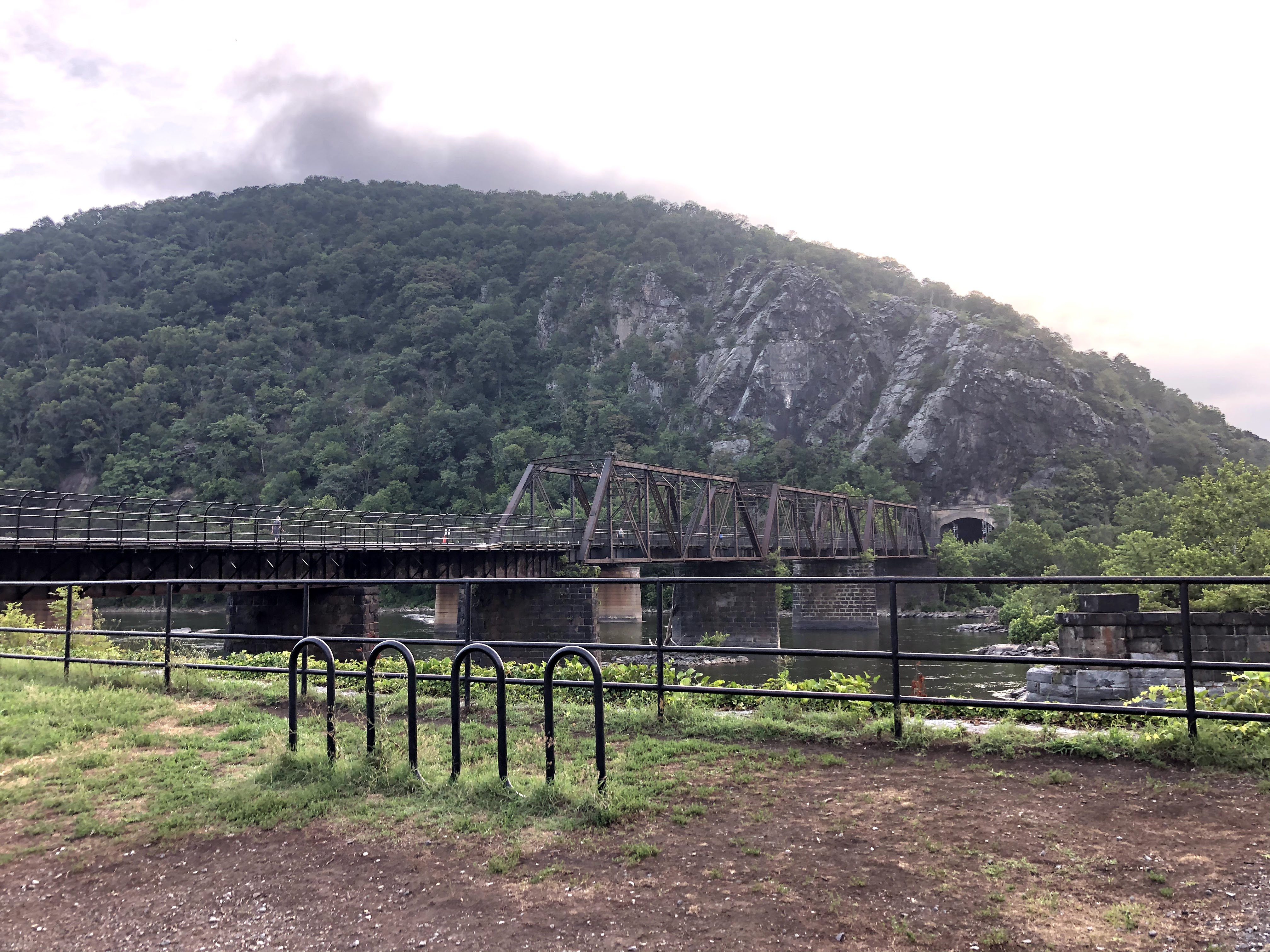After getting all the way through town, you walk along a bridge that takes you over the C&O Canal. People have left love locks on the bridge — sometimes precariously far away from the path where they would have had to climb over the railing to get the lock clipped there. Following the bridge is a metal spiral staircase that sets you down on the Maryland side of the trail. It was the nicest section of the trail we walked on, and it reminded me of our honeymoon to Prince Edward Island. The trail was wide enough for four people to walk side by side, and there were lots of cyclists out. We didn’t think that we could get six feet apart comfortably so we did mask up every time someone passed us. Thankfully, it was still early in the morning so we didn’t have to very often.