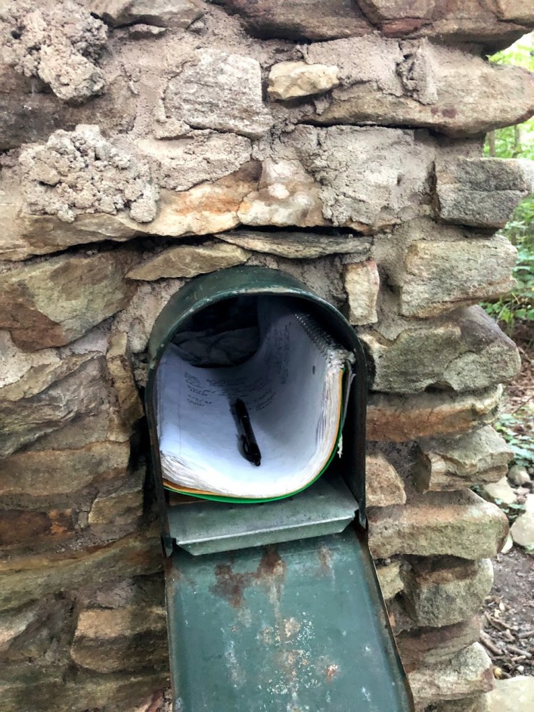 I found that this section of the trail was really interesting in that we passed a lot of landscapes and “things” (I guess) that we hadn’t seen yet so far. After crossing Falls Creek, we passed this little plastic shoe box that used to be filled with “Trail Magic.” Apparently people will leave these boxes on the trail and keep them stocked with first aid supplies, food, or other goodies. There wasn’t anything in this box except maybe a couple band-aids and a broken lighter left nearby.