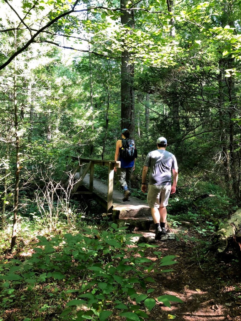 We struggled to find a place to stop and eat lunch, but I’m really glad we kept waffling. Around mile seven we walked into a campground called Old Forge Picnic Grounds, except it took us a minute to realize we were at a campground. We saw a few families up and about playing frisbee or setting up campfires, and I suggested we sit on one of the wooden bridges that allowed for easy creek crossing. But when we stepped on the bridge and it gave way just a little too much for comfort, we moved on. Then, we came across six big rocks, but a few were crawling with ants. Finally, the trail spat us out onto the actual picnic grounds complete with (drumroll) picnic tables!