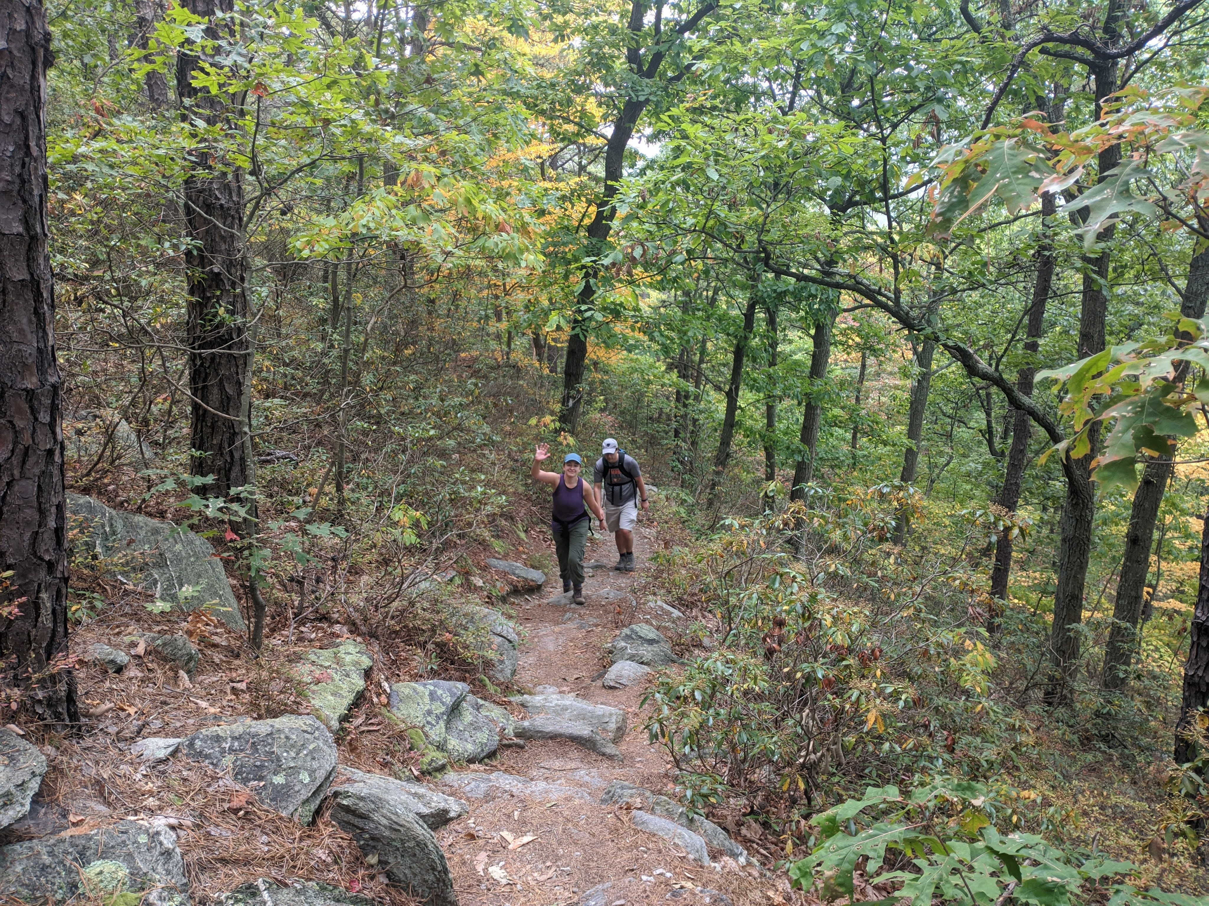 The first mile was easy: gentle terrain, shade, and wide paths. On either side of the trail was water – stagnant and bog-like in some places, running and babbling in others. Soon enough though, we started up the first of three climbs. It brought us to our highest elevation of the day: 1453 feet, but it was the easiest climb overall. For the next several miles, the trail was the trail: single-file in most places, rocky frequently, and shaded. I took my jacket off within the first couple miles.