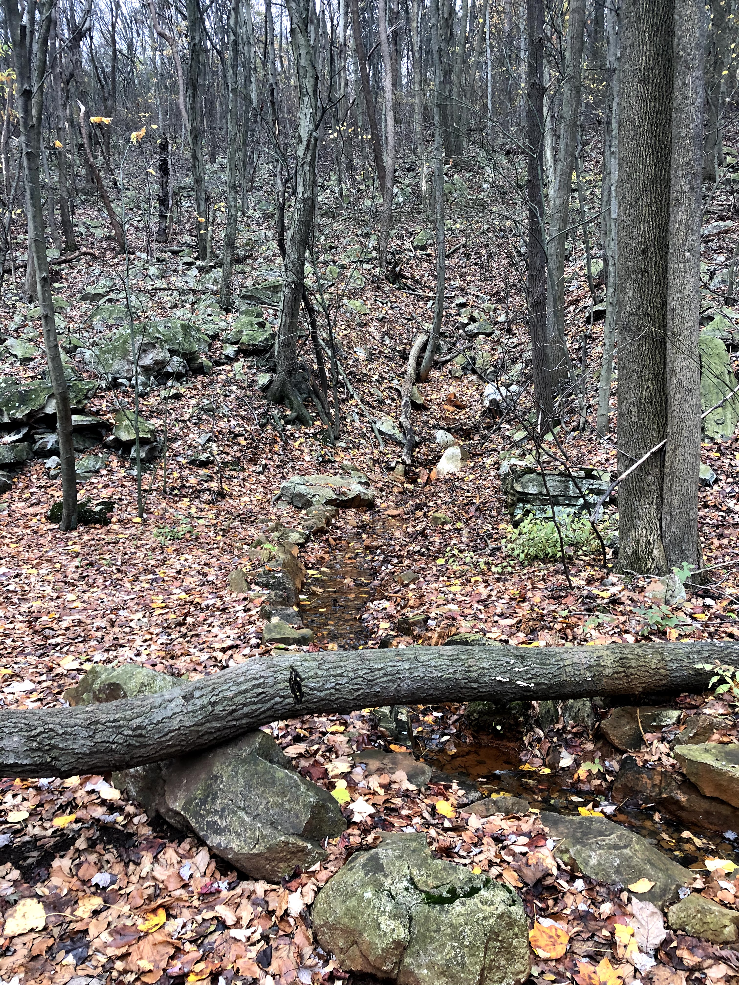 I don’t recommend hiking in Pennsylvania this late in the year. The leaves are wet and the hiking over rocks is just precarious. Add onto that the wind chill that you can experience up on those ridges, it’s just not enjoyable. When we did reach our highest elevation, the wind whipped around our ears. I walked with mittens on and my hands held under my armpits; Henry kept his hands in his pockets. It was fairly flat, a welcome change, and we could see our breath. Around mile six or seven, we started going downhill and at about the time the rhododendron started to line the trail again you could feel the temperature change for the better. The mittens came off, and we became much more comfortable.