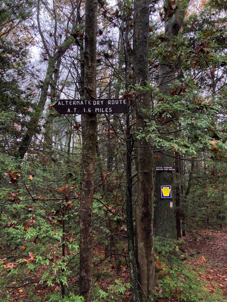 If we had done any kind of preparation at all, we would have known what was coming. I would have known what an “Alternative Dry Route” was, and Henry would likely have not said, “Let’s go, I’m no quitter.” For we came to a fork where one trail wound down a road and hooked up with the AT after about 1.6 miles, shown in the picture. The other said “Beaver Dam Crossing.” Again, if I had looked online, I would have seen people say things like “Beaver Dam washed out” and “Beaver Dam impassable” and “Take the dry route!” But we didn’t. Instead, in my head thinking this was the cute name of a bridge, we found this a little way down the trail.