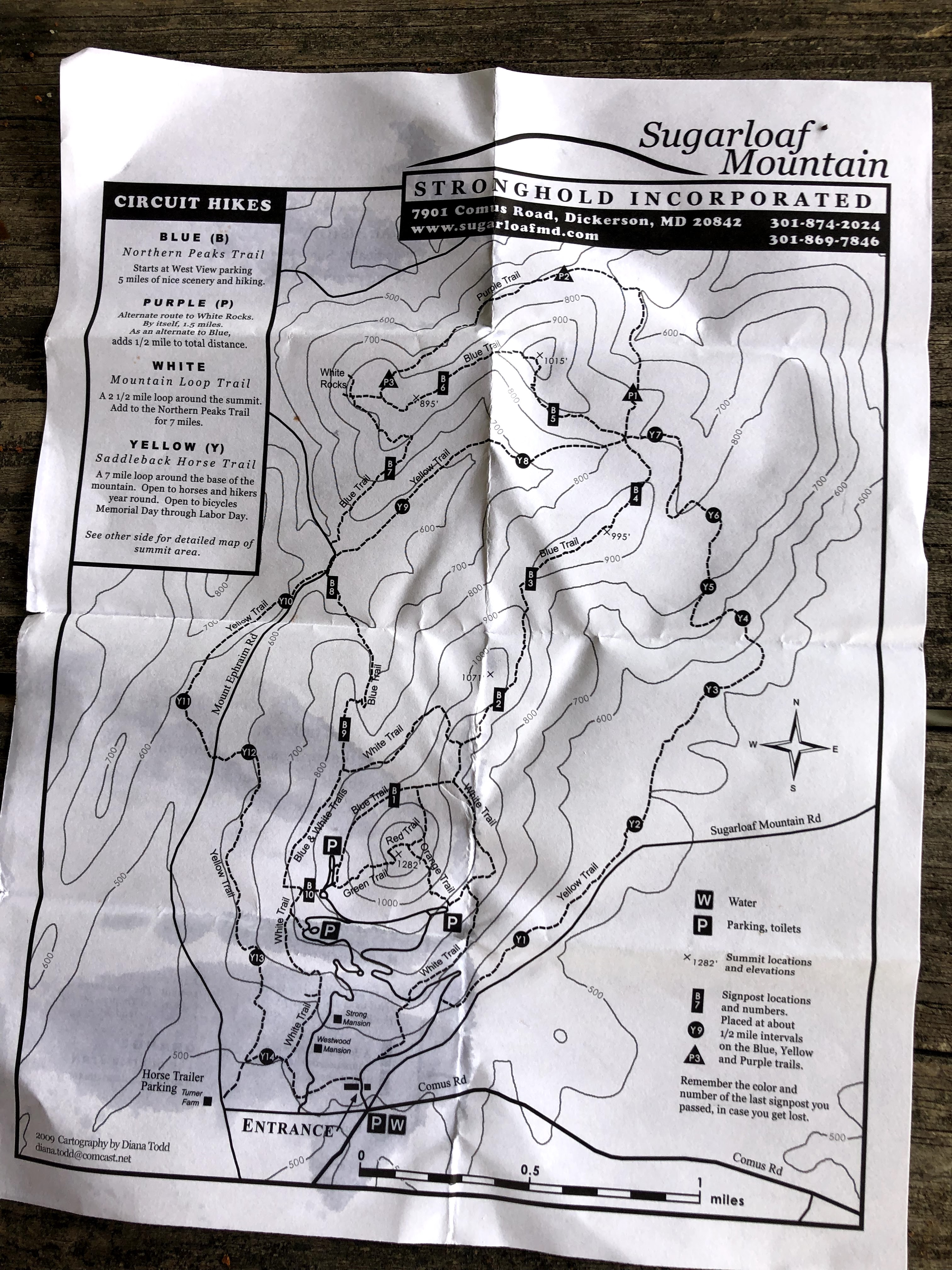 The hike we chose to practice on was Maryland’s Sugarloaf Mountain. There are lots of other Sugarloaf Mountains, including in Virginia (about 3x as high as Maryland’s) and Brazil (about as high as ours but jutting out into the Atlantic Ocean overlooking Rio). Maryland’s Sugarloaf is tended to by a private group called The Stronghold. They don’t have garbage cans on the property anymore and ask that all trash brought in is packed out. They do have receptacles for pet waste, and unfortunately a lot of people use them as trash cans.